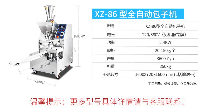 名稱BZ-30型單餡斗包子機(jī) 電源220/380V(見機(jī)器名牌) 功率2.5kw 產(chǎn)量1800個(gè)/小時(shí) 尺寸1440*680*1470mm 重量300kg 規(guī)格25-100克/個(gè) 其他