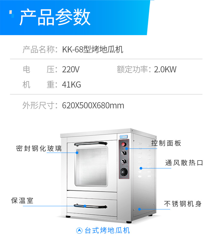 名稱(chēng)KK-68型烤地瓜機(jī) 電源220V 功率2.0kw 產(chǎn)量 尺寸620×500×680mm 重量41kg 規(guī)格 其他
