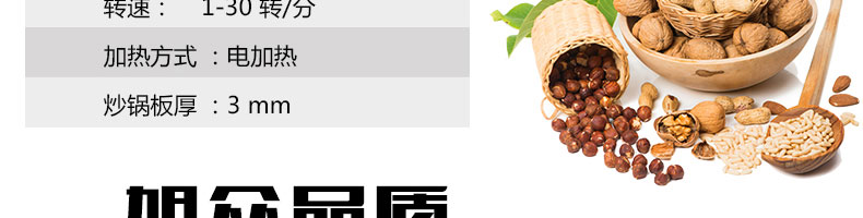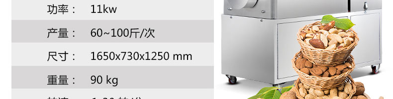 8.適合加工各種干果和堅果類,如;板栗、花生、瓜子、松籽、榛子、杏仁、菜籽、咖啡豆、紅棗、芝麻、、核桃、各種豆類、麥類、米類等。適用于在食品加工廠、農貿市場、食品專賣店、連鎖店等處定點加工和經營,符合生產、創(chuàng)業(yè)致富的需要。