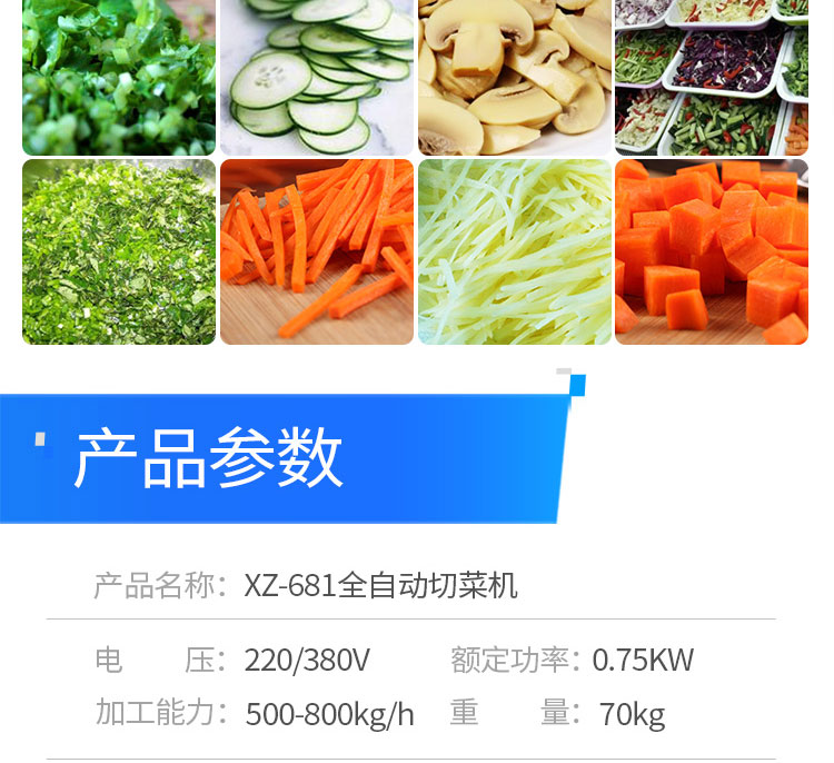 XZ-681多功能切菜機,本設(shè)備可切葉菜可切片、絲、段等,葉菜類,切割尺寸: 1 - 60mm 可以調(diào)整,適用客戶群:食品廠,凈菜加工;學(xué)生營養(yǎng)餐,餐飲連鎖,中央廚房,企業(yè)食堂等。