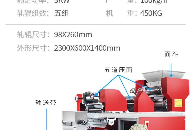 MT5-250面條機(jī) (掛面機(jī)或濕面機(jī)) | 外形尺寸:2300×600×1400mm 產(chǎn)量:200kg/h 軋輥:98×260mm 功率:3kw 軋輥組數(shù):5組 機(jī)重:450kg | 鐵外殼 |