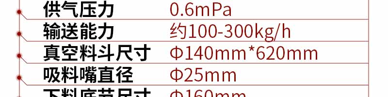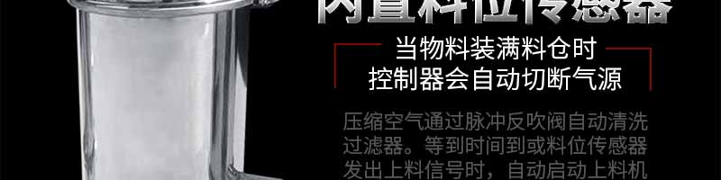 當(dāng)壓縮空氣供給真空發(fā)生器時(shí),真空發(fā)生器就產(chǎn)生負(fù)壓形成真空氣流,物料被吸入吸料咀,形成物氣流,經(jīng)過吸料管到達(dá)上料機(jī)的料倉內(nèi)。過濾器把物料與空氣分離,當(dāng)物料裝滿料倉時(shí),控制器會自動切斷氣源,真空發(fā)生器停止工作,同時(shí)料倉門自動開啟,物料落到設(shè)備的料斗中。與此同時(shí),壓縮空氣通過脈沖反吹閥自動清洗過濾器。等到時(shí)間到或料位傳感器發(fā)出上料信號時(shí),自動啟動上料機(jī)。