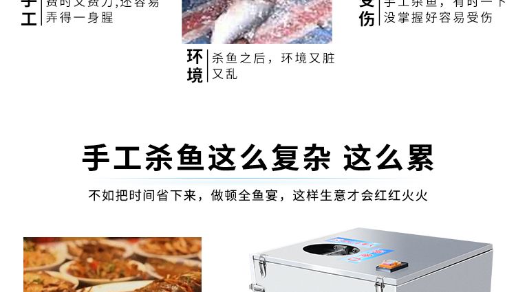 本設(shè)備為魚(yú)類(lèi)食品加工廠,大型超市,機(jī)關(guān)食堂,海鮮市場(chǎng),農(nóng)貿(mào)市場(chǎng),烤魚(yú)店,酸菜魚(yú)店,火鍋店等餐飲酒店帶來(lái)高工作效率。