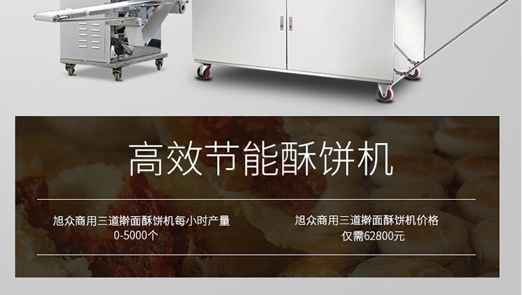 旭眾牌XZ-15C三道搟面酥餅機是我公司仿手工制作面食產(chǎn)品的機型,占地面積小,重量輕,它吸收國內(nèi)傳統(tǒng)手工制作技術(shù),即運用搟面杖壓面和打擊面團(tuán),以保證高面筋性和面帶的密度,并綜合考慮面食的口感而研發(fā)。
