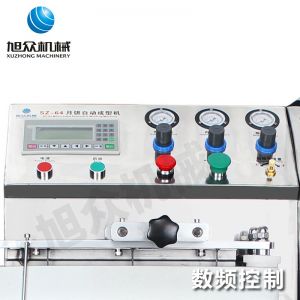 旭眾牌SZ-64型月餅自動成型機(jī)是一款多功能的設(shè)備,其具備的功能有:月餅計數(shù)、數(shù)字清零、月餅位置定位、月餅花紋深度調(diào)節(jié)、外模對內(nèi)模提前動作時間調(diào)節(jié)以及成型時輸送帶延時時間調(diào)節(jié)。