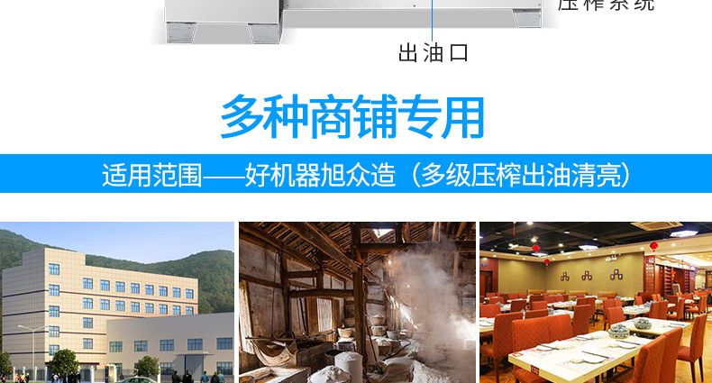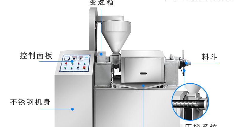 大型榨油機系列,每小時產(chǎn)量150斤物料(根據(jù)物料不一樣產(chǎn)量也不一樣),輔助設(shè)備配離心濾油機或正壓單桶濾油機(需選配空壓機)、炒貨機配XZ-C80或XZ-CD100
