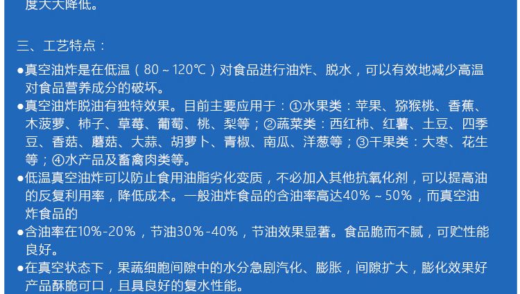 ●真空油炸是在低溫(80~120℃)對食品進行油炸、脫水,可以有效地減少高溫對食品營養(yǎng)成分的破壞。