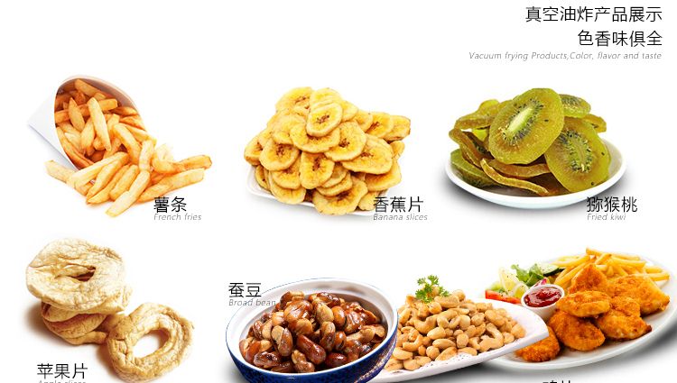 ●保色作用:采用真空油炸,油炸溫度大大降低,而且油炸鍋內(nèi)的氧氣濃度也大幅度降低。油炸食品不易褪色、變色、褐變,可以保持原料本身的顏色。如獼猴桃極易受熱褐變,若采用真空油炸,可以保持其綠色。