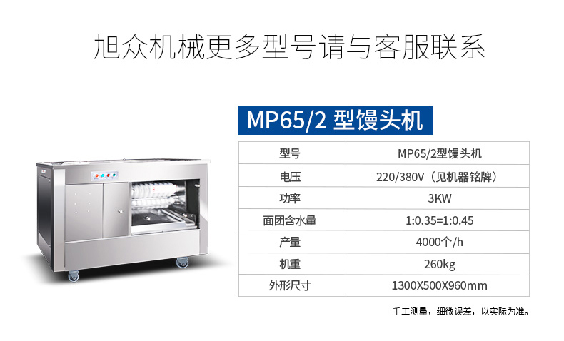 ?自動(dòng)化程度高,定量準(zhǔn)確,制品大小統(tǒng)一,饅頭面帶厚度、成型、切段大小均可隨意調(diào)控;