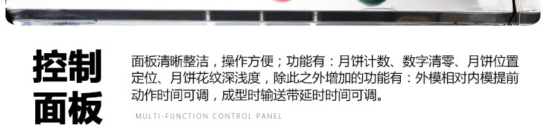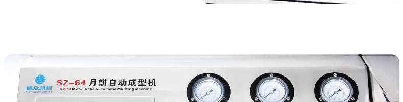 旭眾牌SZ-64型月餅自動成型機是一款多功能的設(shè)備,其具備的功能有:月餅計數(shù)、數(shù)字清零、月餅位置定位、月餅花紋深度調(diào)節(jié)、外模對內(nèi)模提前動作時間調(diào)節(jié)以及成型時輸送帶延時時間調(diào)節(jié)。